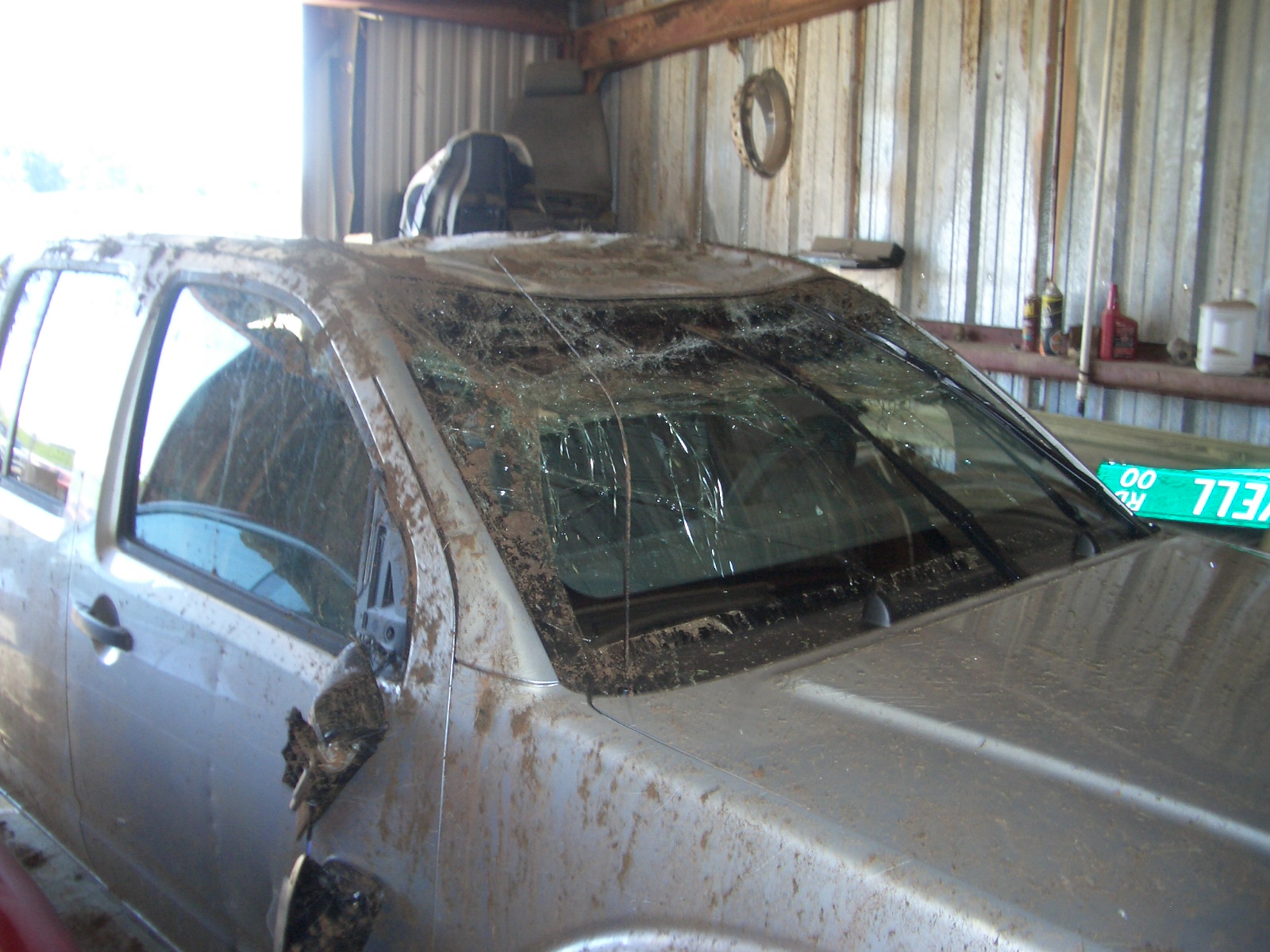 In late June of 2007 it met an untimely demise due to my stupidity and aggressiveness on the road. I was coming home from bowling with my co-workers on a rainy Thursday night. It had been raining it seemed every day that June so everything was water logged and the roads were no exception. I came to a point in the road where it was going to merge pretty soon and I was in the lane that needed to merge. There were 2 or 3 cars that I could have either fallen in behind to merge or speed up and try to pass, I chose the latter. I sped up to at least 60 mph (in a 45 mph zone) to pass these cars. The road at this point dips down a hill then up and at the bottom of that hill I encountered a huge puddle of water filling the lane that I was in. I hit the water at a much too high rate of speed and hydroplaned out of control across the other lane (thank God there were no cars coming that direction) and through a fence before it rolled upside down. There I sat belted in my seat feeling like a complete moron for what I’d just done… I remember thinking as I was skidding out of control towards the ditch how I was going to high-tail it out of there as soon as the skid came to a stop. When I was upside down in the truck I knew the option to get the heck out of there wasn’t available. I turned off the truck, unbuckled my seatbelt and crawled out of the passenger window into the mud waiting to face whatever consequences would come.